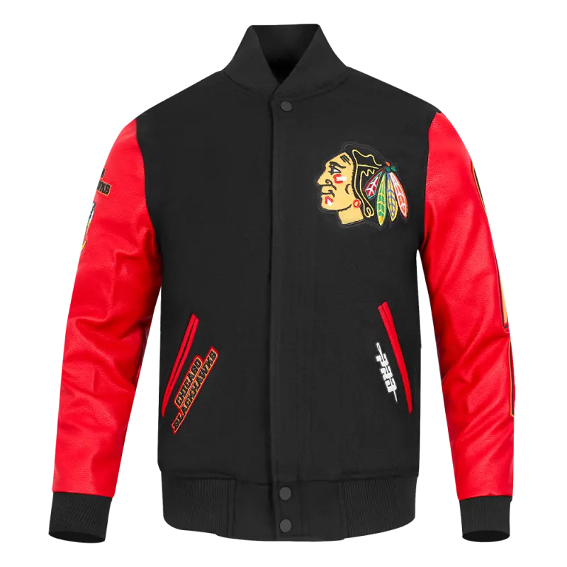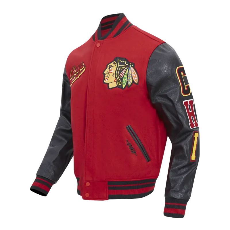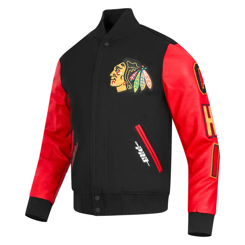 NHL CHICAGO BLACKHAWKS RETRO CLASSIC MEN’S RIB WOOL VARSITY JACKET (BLACK\/RED\/BLACK)