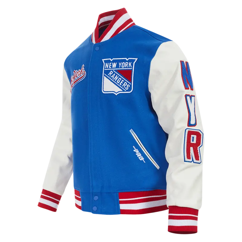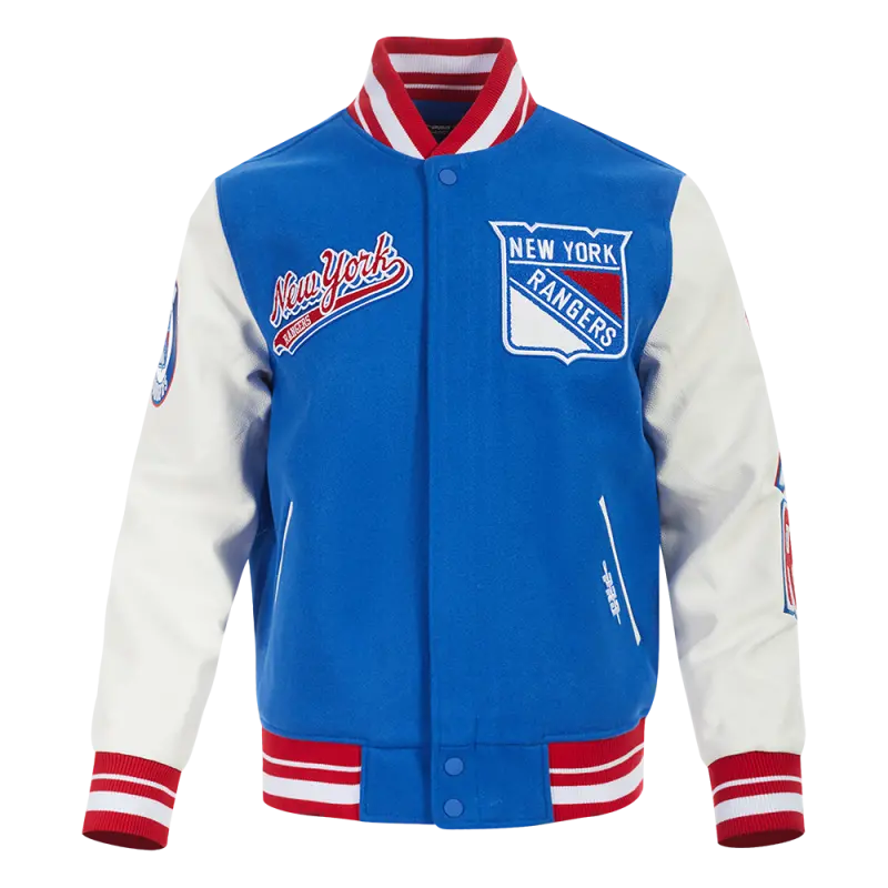 NHL NEW YORK RANGERS SCRIPT TAIL WOMEN’S WOOL VARSITY JACKET (ROYAL BLUE\/RED)