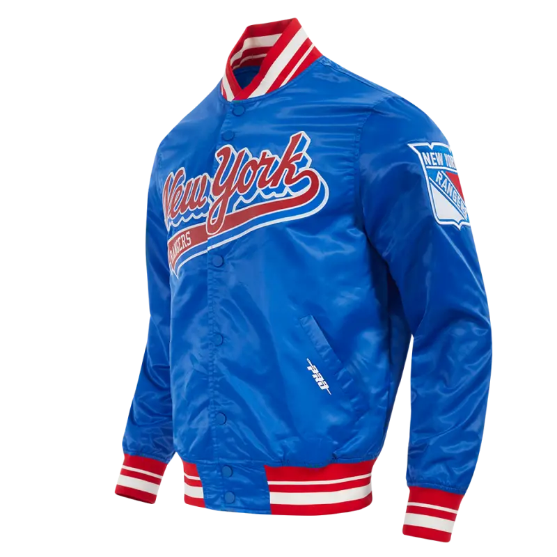 NHL NEW YORK RANGERS SCRIPT TAIL MEN’S SATIN JACKET (ROYAL BLUE\/RED)
