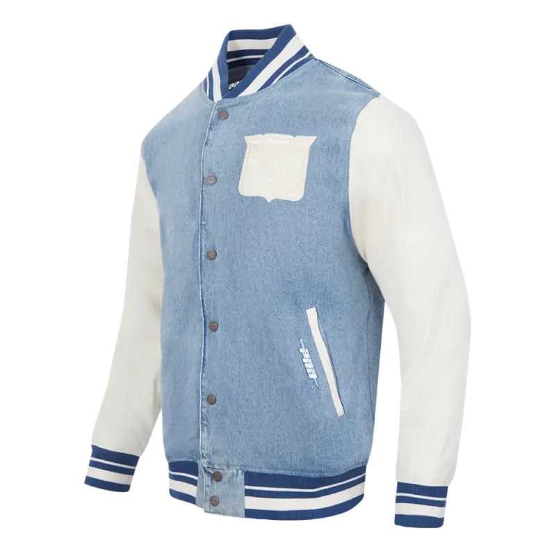 NHL NEW YORK RANGERS VARSITY BLUES MEN’S DENIM VARSITY JACKET (DENIM\/LINEN)