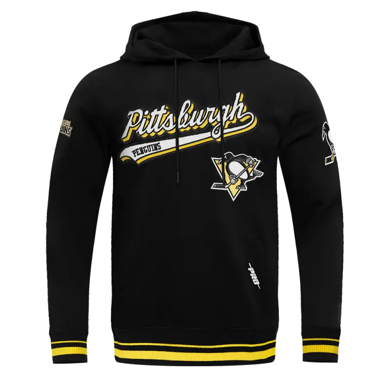 NHL PITTSBURGH PENGUINS SCRIPT TAIL MEN’S RIB FLEECE PULLOVER HOODIE (BLACK\/YELLOW)