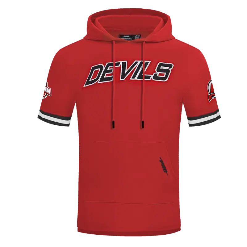 NHL NEW JERSEY DEVILS CLASSIC CHENILLE MEN’S DOUBLE KNIT SHORT SLEEVE PULLOVER HOODIE (RED\/BLACK)
