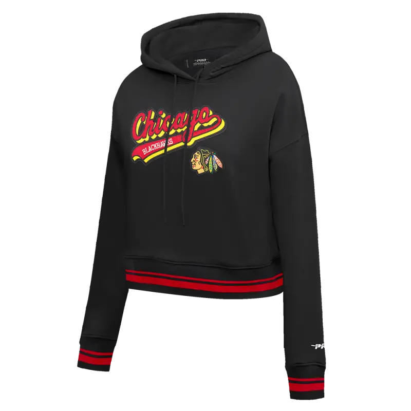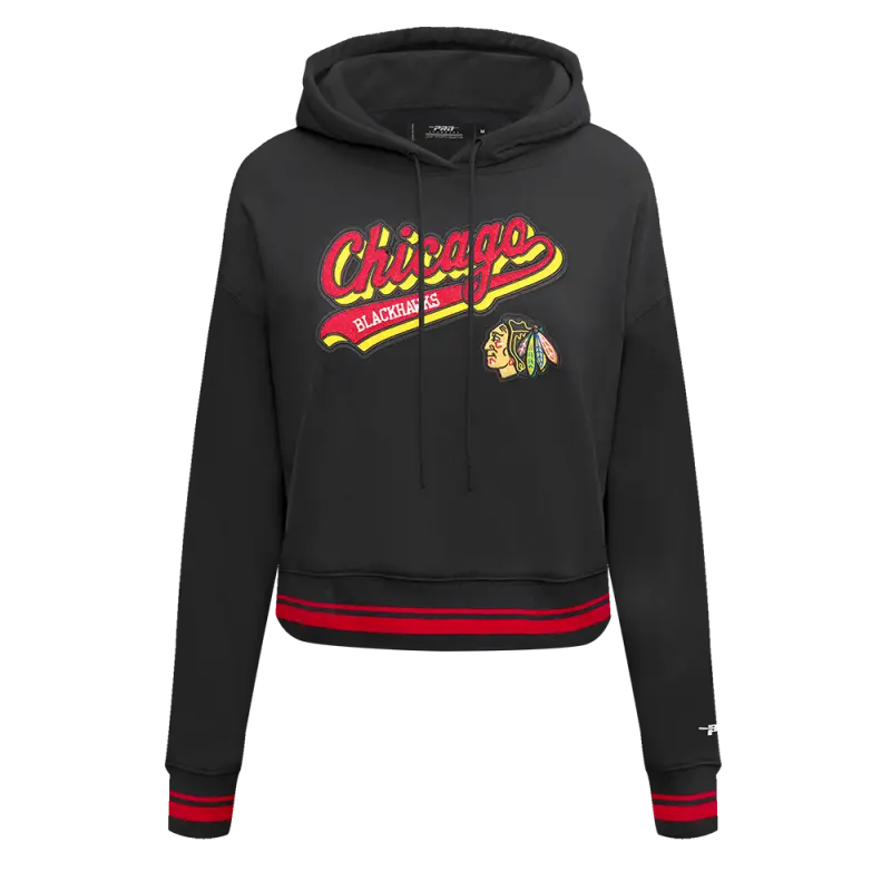 NHL CHICAGO BLACKHAWKS SCRIPT TAIL WOMEN’S RIB FLEECE CROPPED PULLOVER HOODIE (BLACK\/RED\/BLACK)