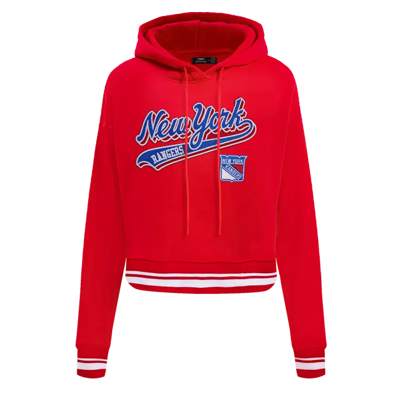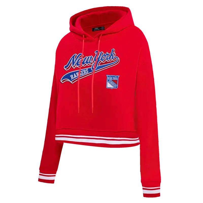 NHL NEW YORK RANGERS SCRIPT TAIL WOMEN’S RIB FLEECE CROPPED PULLOVER HOODIE (RED)