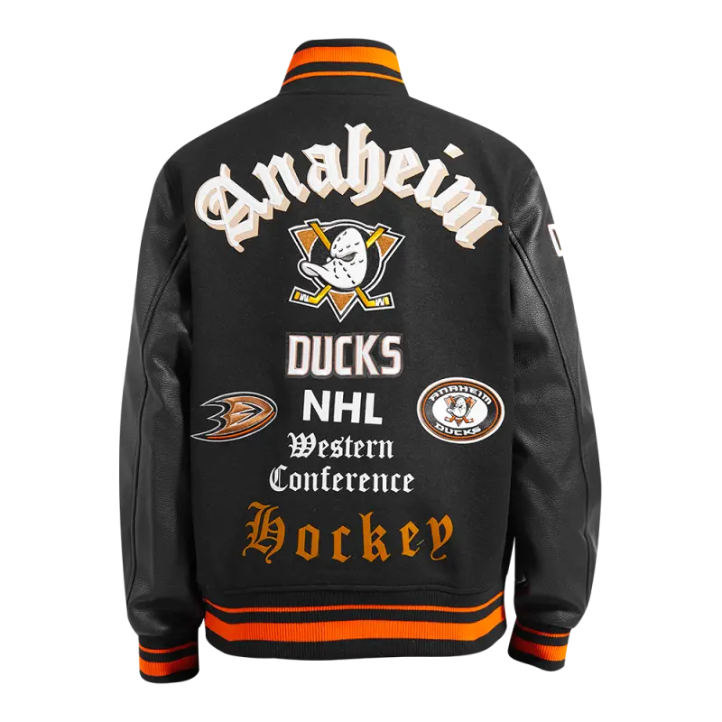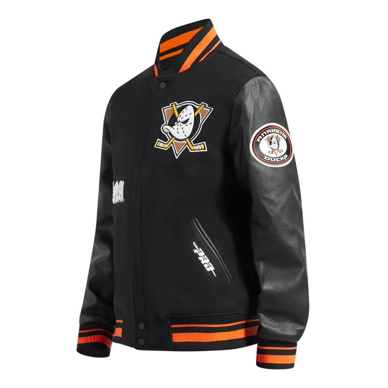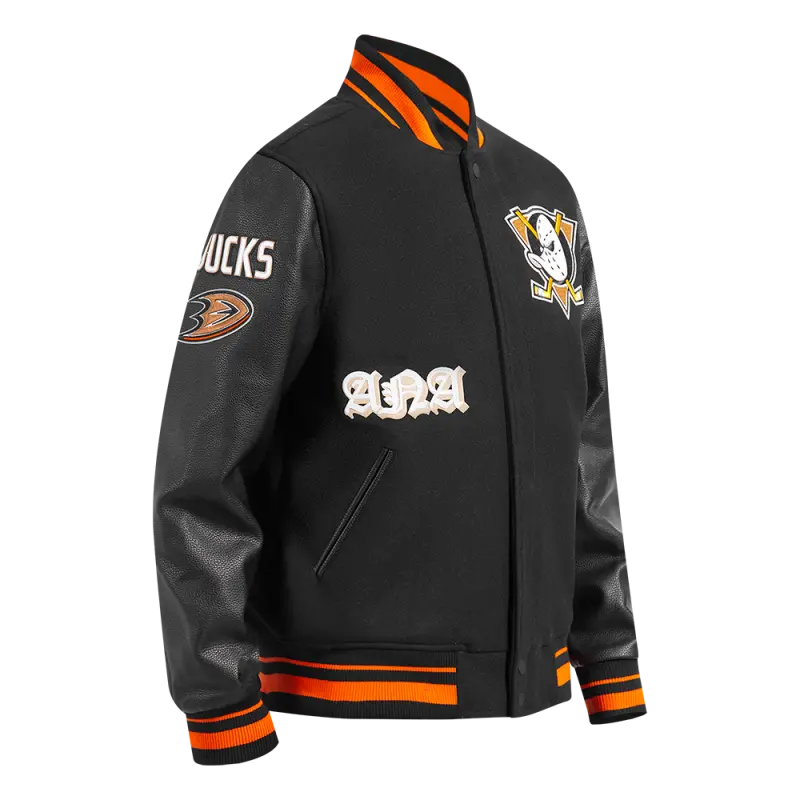 The Pro Standard Premium NHL Anaheim Ducks Old English Men’s Rib Wool Varsity Jacket (Black/Orange)