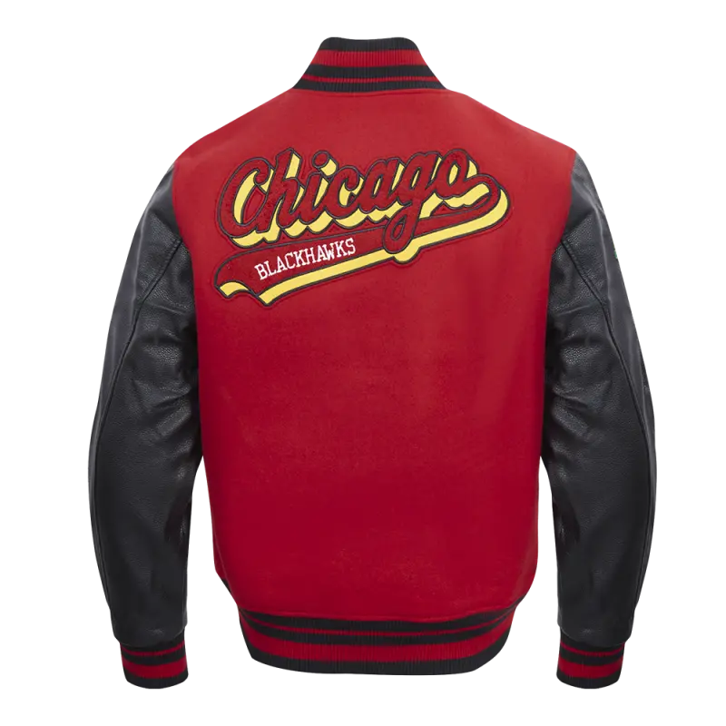 NHL CHICAGO BLACKHAWKS SCRIPT TAIL MEN’S RIB WOOL VARSITY JACKET (RED\/BLACK)