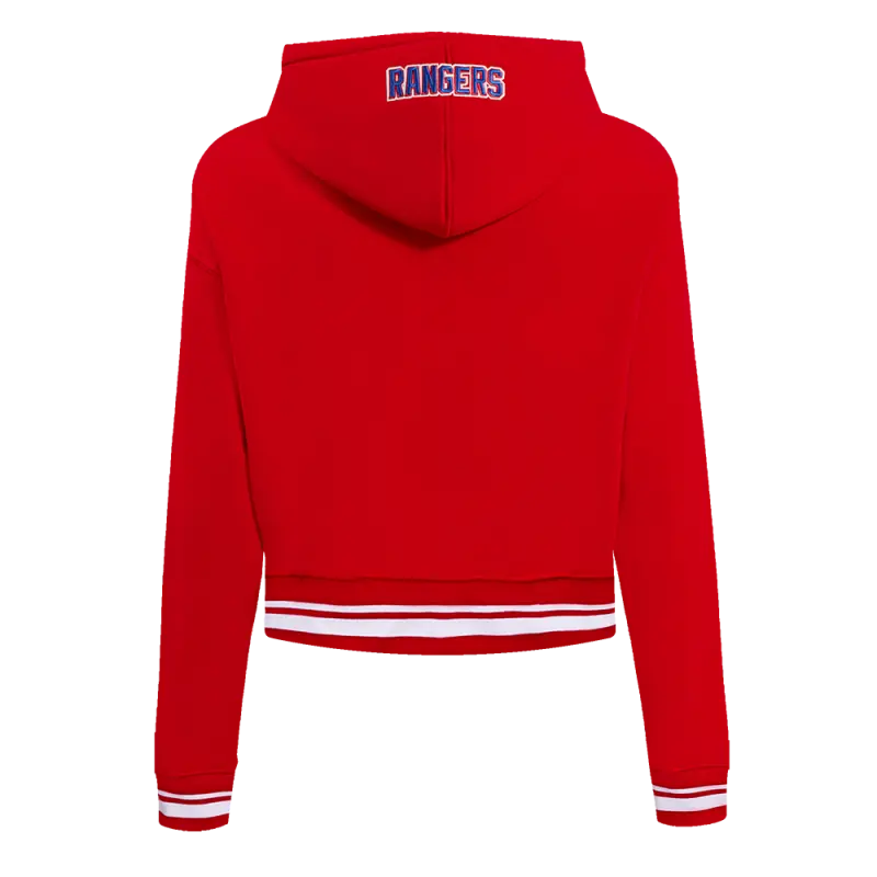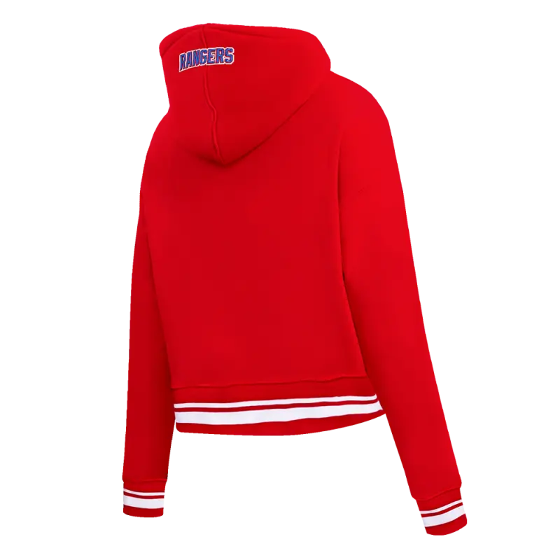 NHL NEW YORK RANGERS SCRIPT TAIL WOMEN’S RIB FLEECE CROPPED PULLOVER HOODIE (RED)